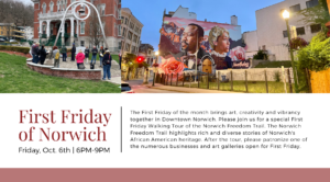 The First Friday of the month brings art, creativity and vibrancy together in Downtown Norwich. Please join us for a special First Friday Walking Tour of the Norwich Freedom Trail. The Norwich Freedom Trail highlights rich and diverse stories of...
